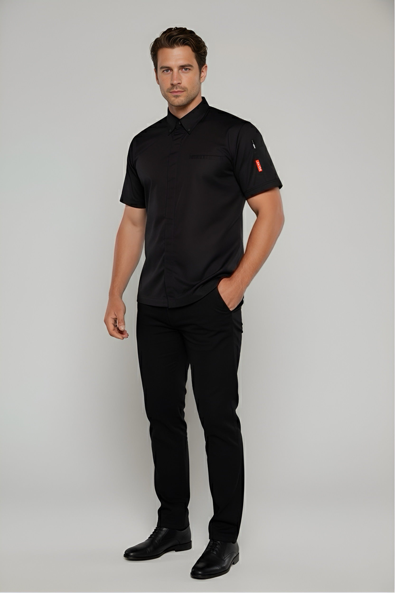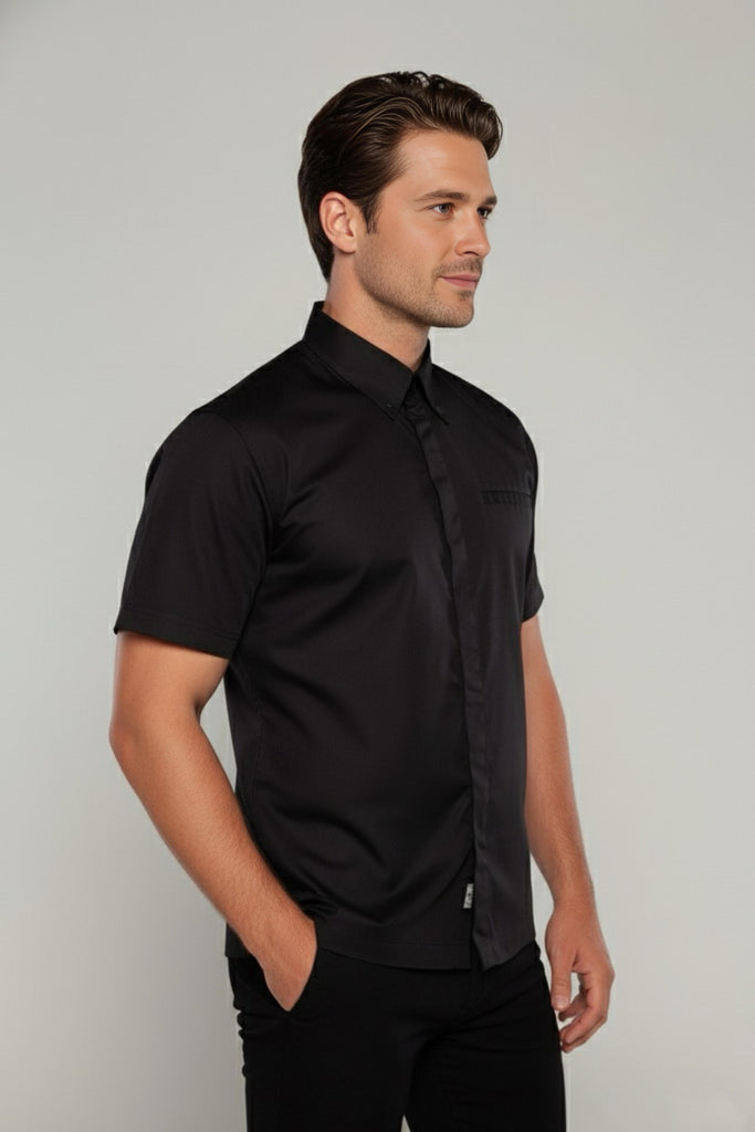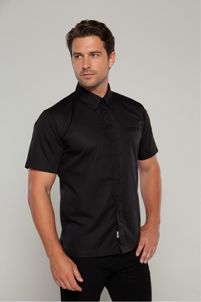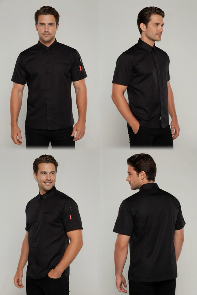 Our chef shirt features a classic shirt collar and short sleeves, exuding professionalism while keeping you cool and composed throughout your culinary endeavors. With double stitching throughout, reinforced seams, and hidden press buttons strategically placed at the center and collar sides, this shirt combines functionality with a polished appearance, guaranteeing a sleek and sophisticated look in any kitchen environment.