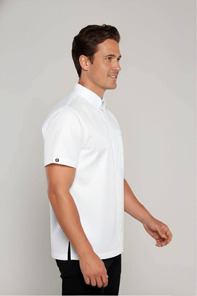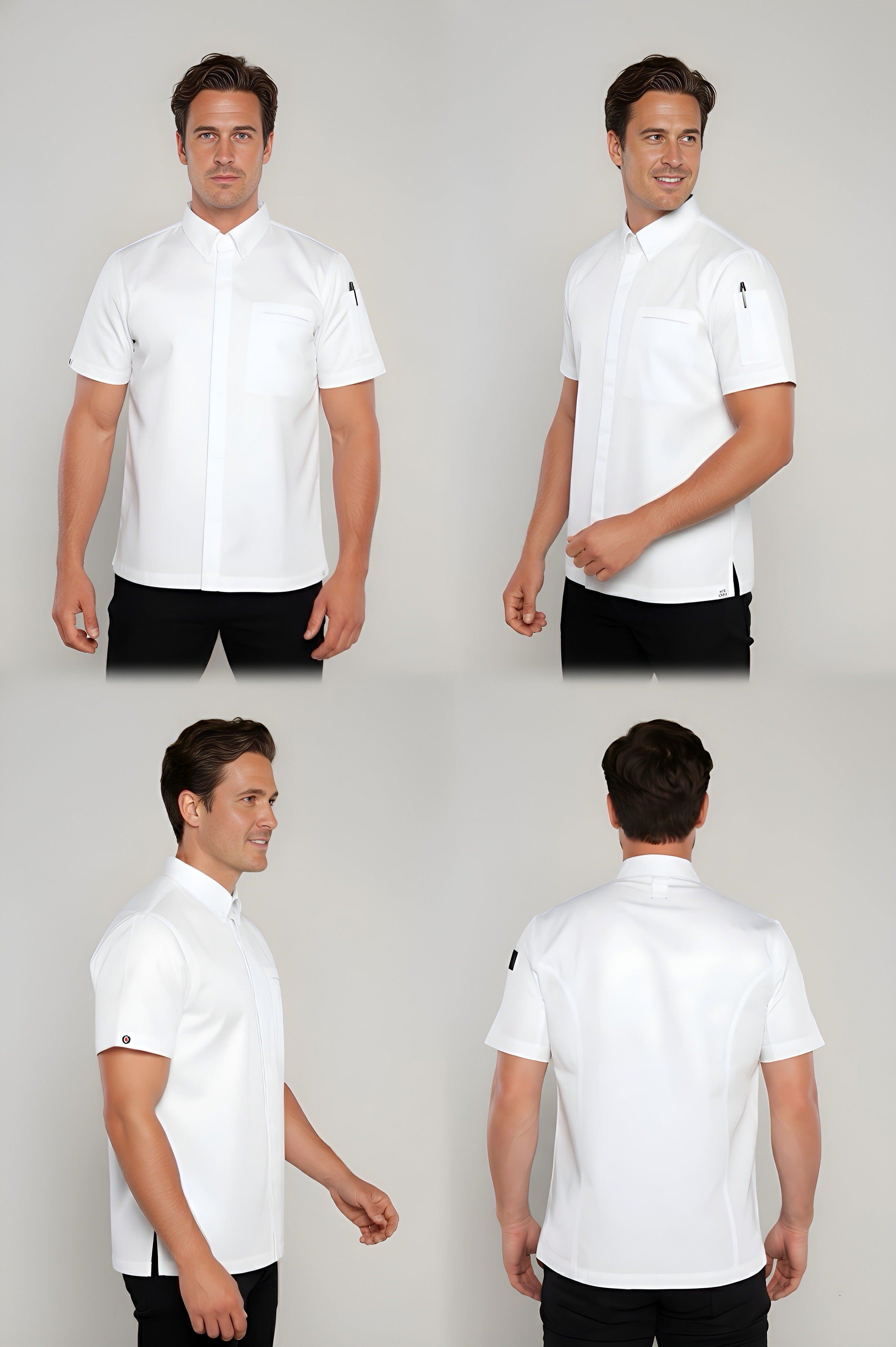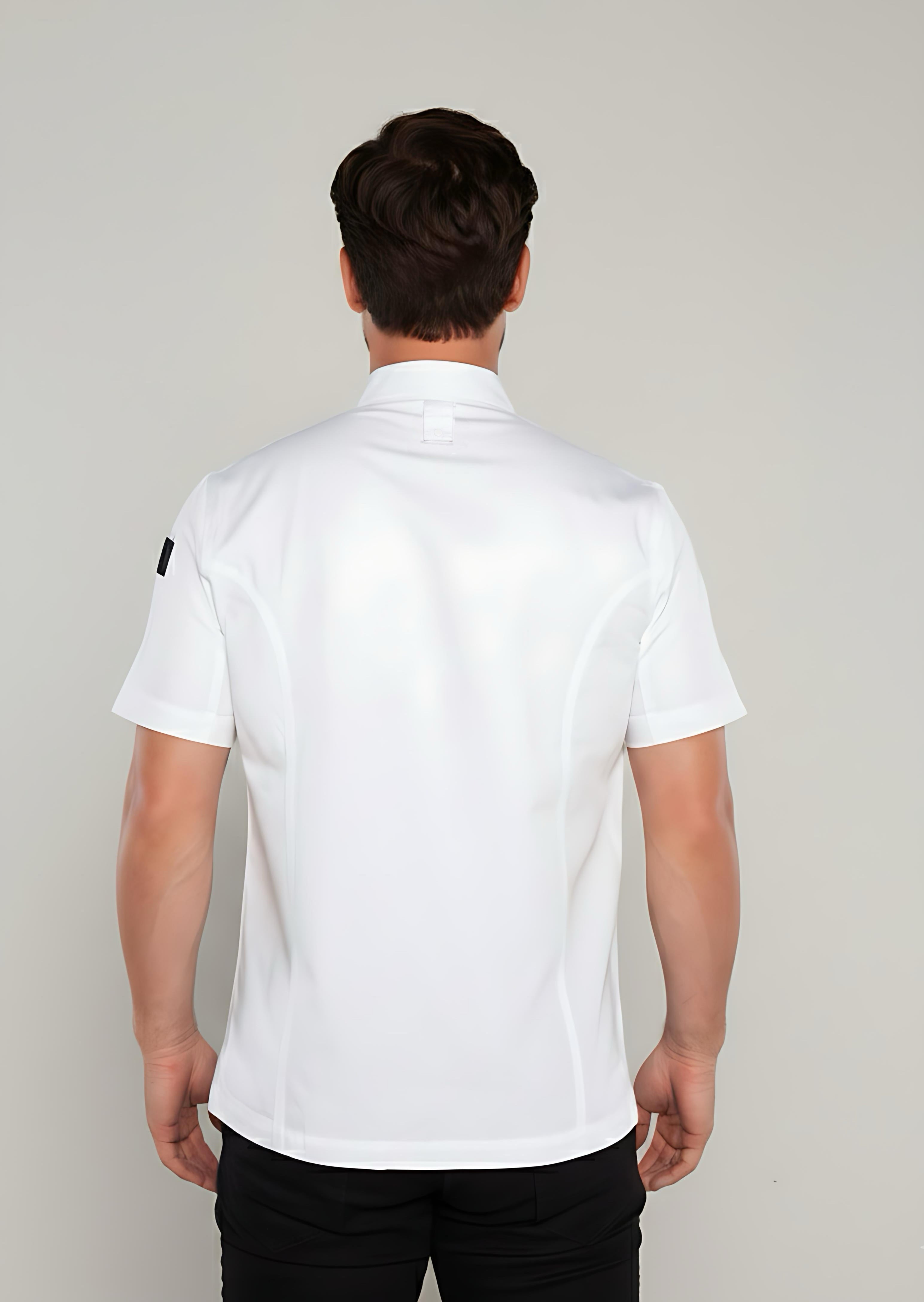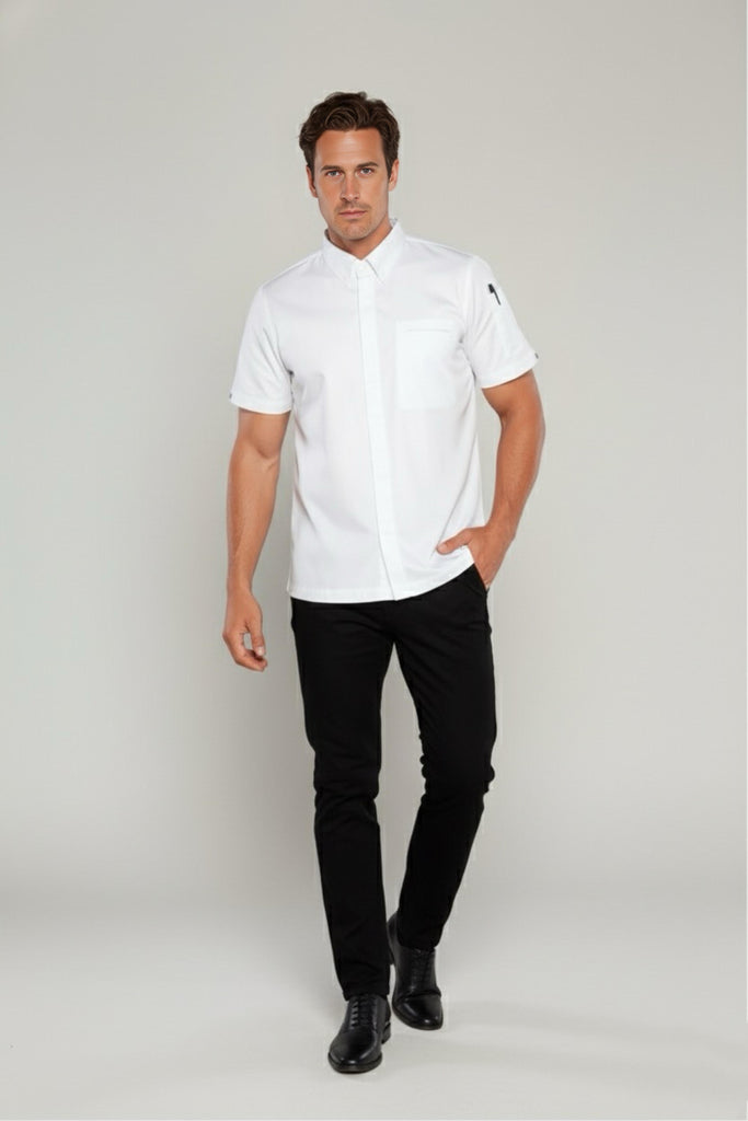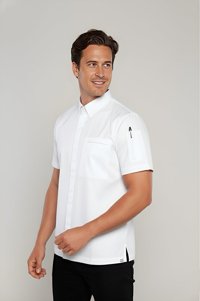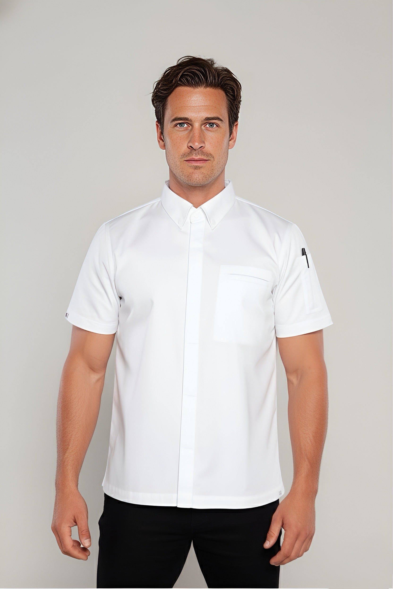 Our chef shirt features a classic shirt collar and short sleeves, exuding professionalism while keeping you cool and composed throughout your culinary endeavors. With double stitching throughout, reinforced seams, and hidden press buttons strategically placed at the center and collar sides, this shirt combines functionality with a polished appearance, guaranteeing a sleek and sophisticated look in any kitchen environment.