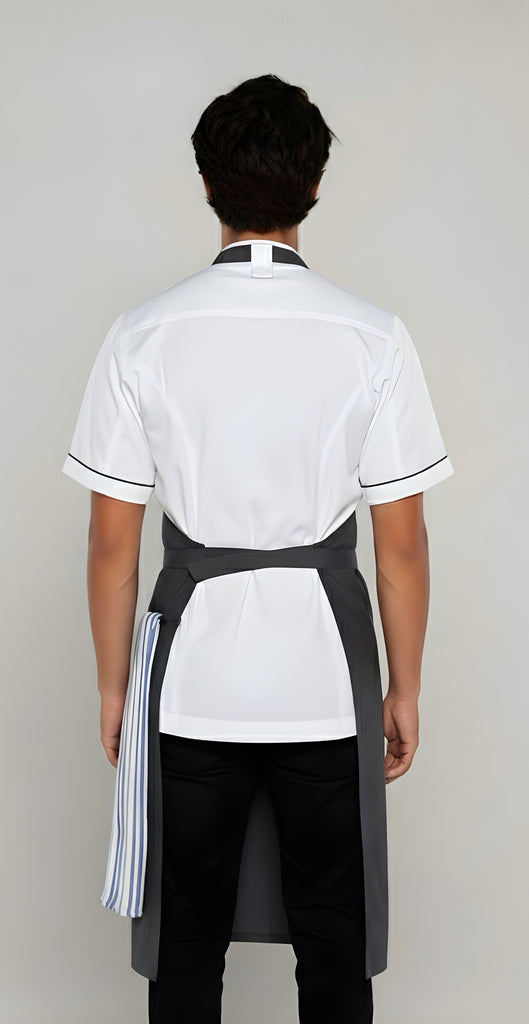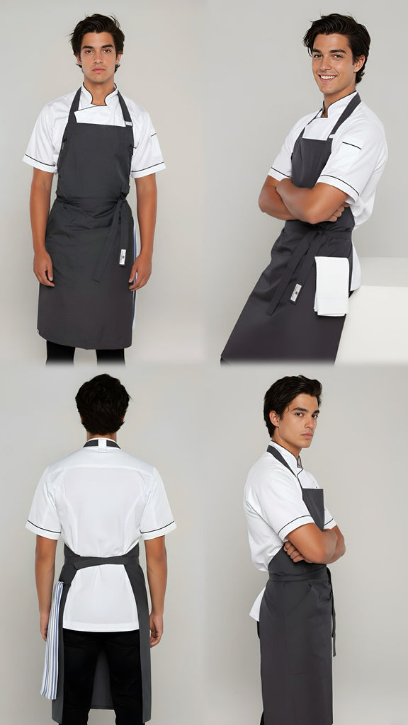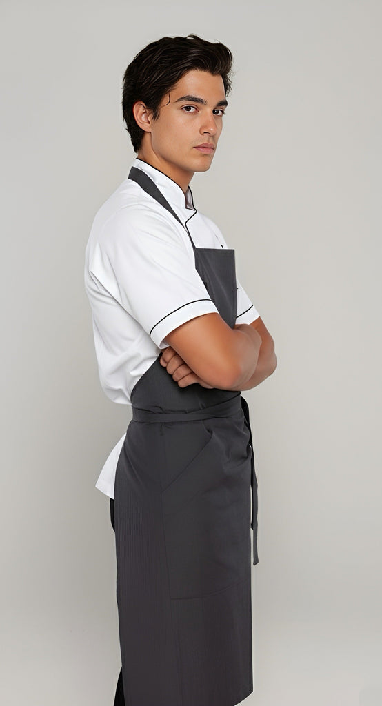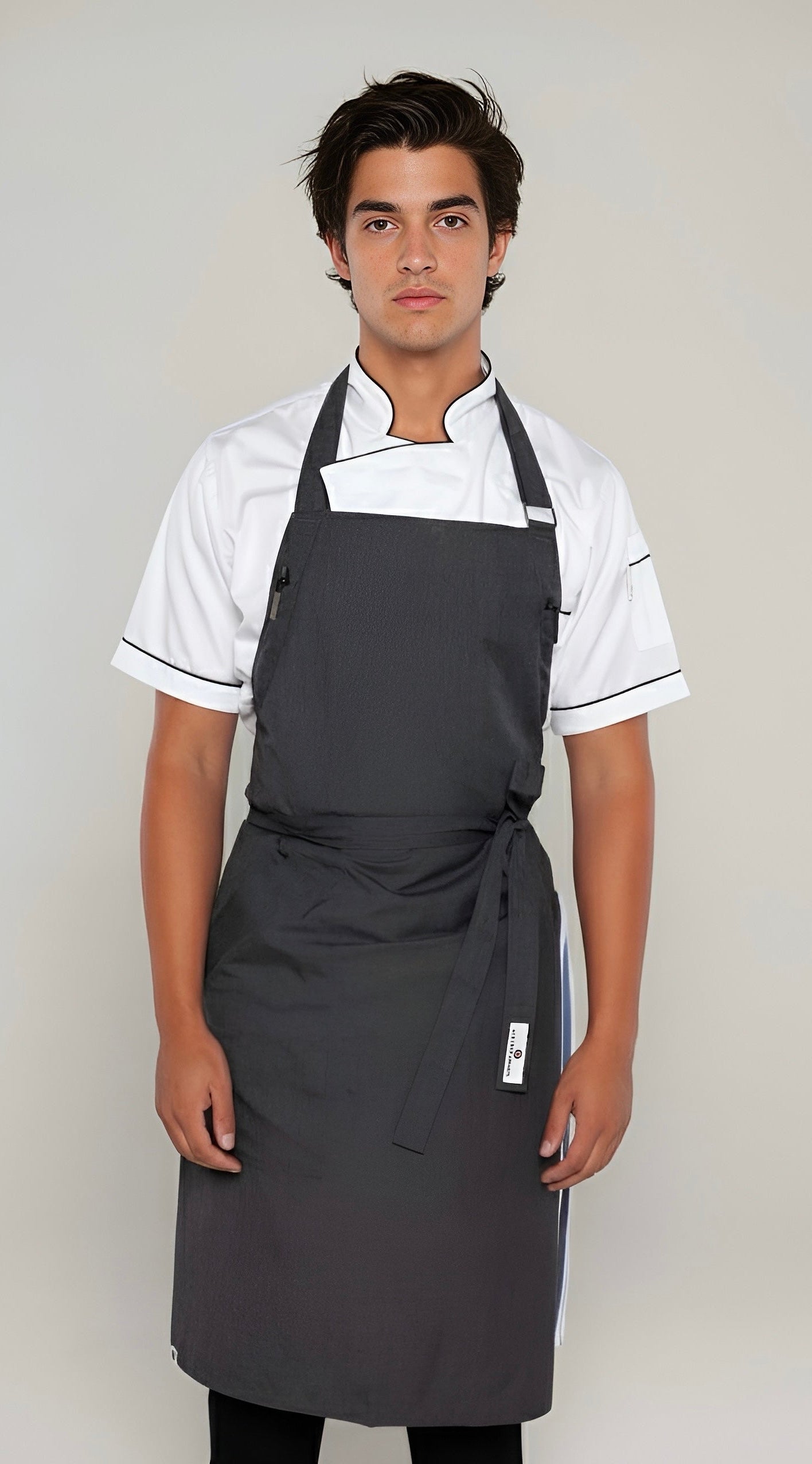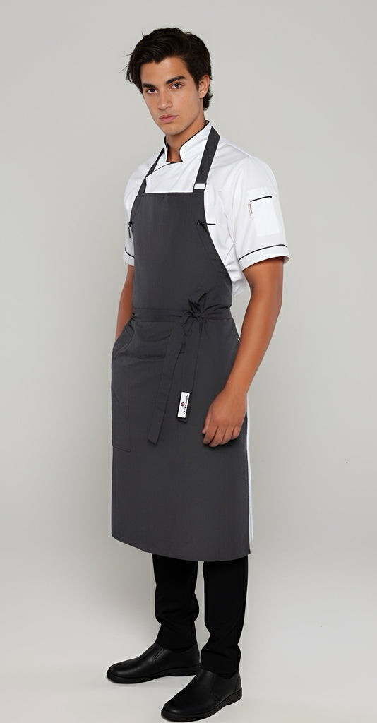 The Model in the picture is 5'7" tall. This Apron will suit anyone up to 6 feet Tall.