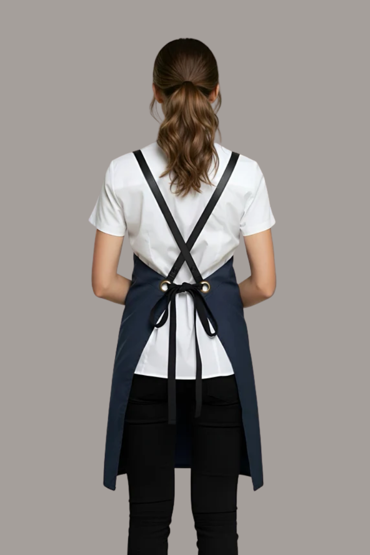 The crossover back design evenly distributes weight across the shoulders, reducing neck strain and allowing greater comfort throughout busy service hours. Its interchangeable strap system with brass eyelets allows you to customise the look of your apron while ensuring a secure fit.