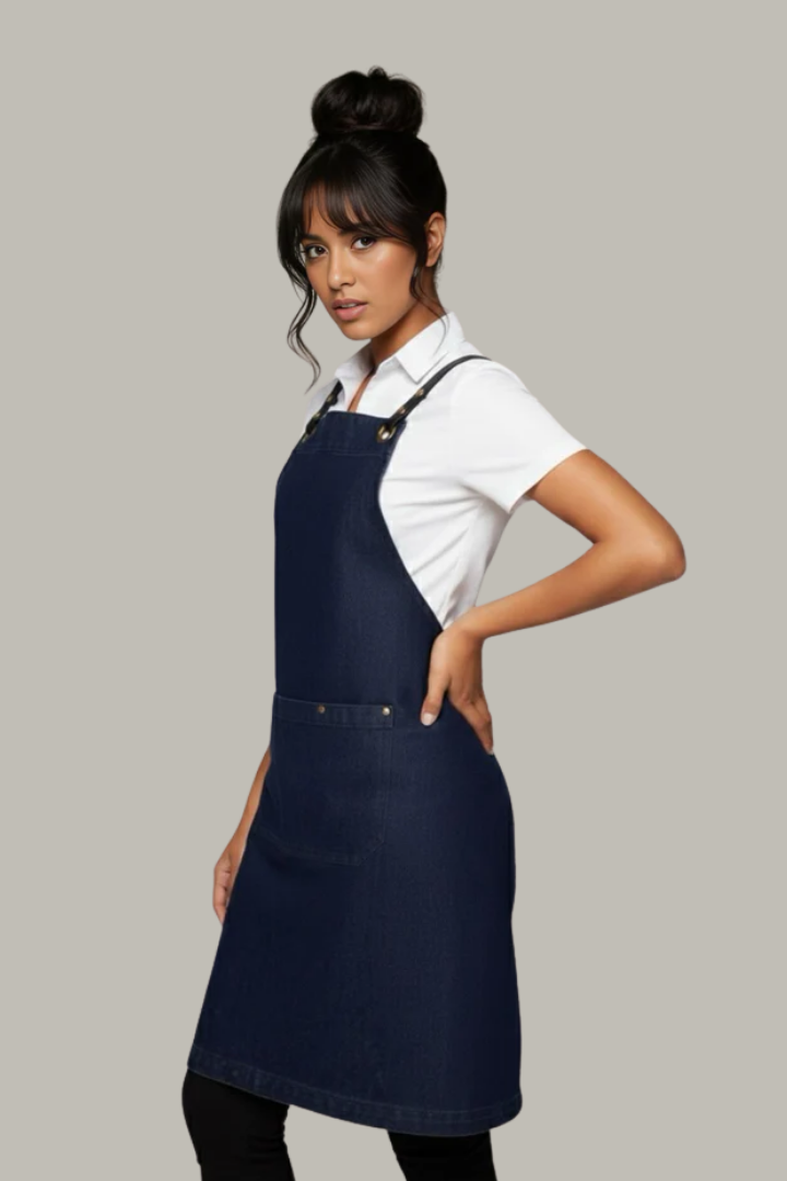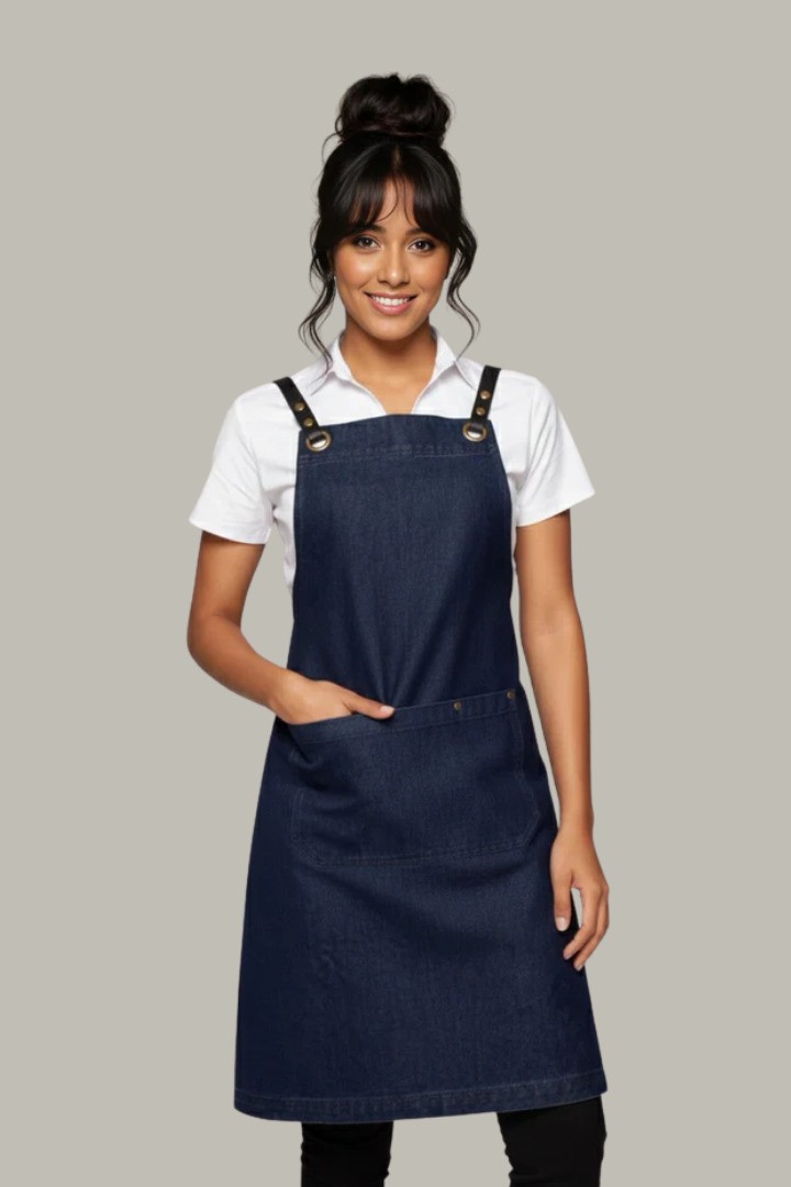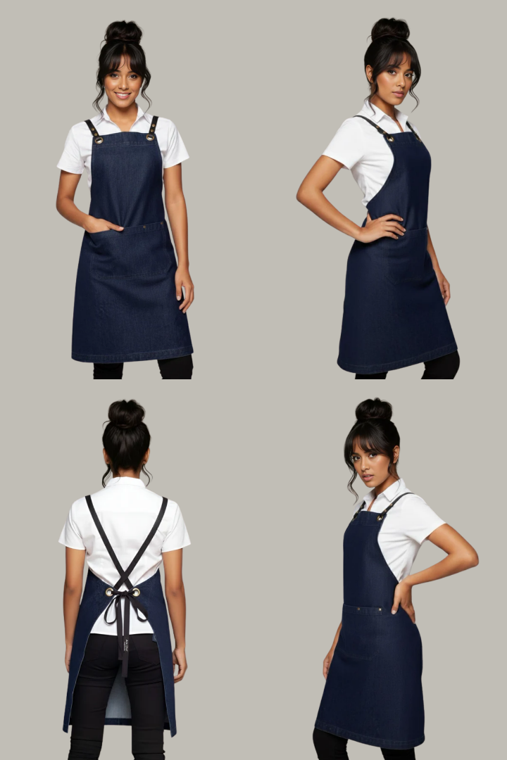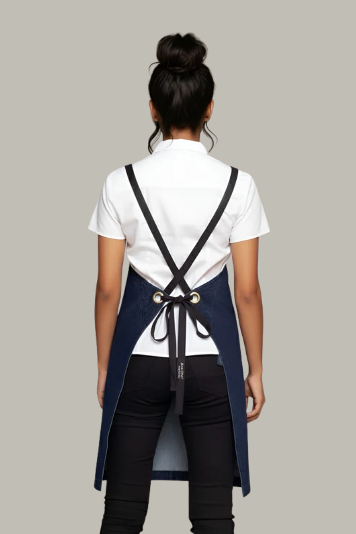 Made from durable denim fabric, it features a crossover back design that distributes weight across the shoulders to reduce neck strain. The interchangeable strap system with brass eyelets and durable PU straps allows you to customize the look while ensuring a secure, comfortable fit. Reinforced bartacks, strong stitching, and spacious utility pockets with pen slots make it practical for chefs, baristas, bartenders, and front-of-house staff in busy hospitality environments.