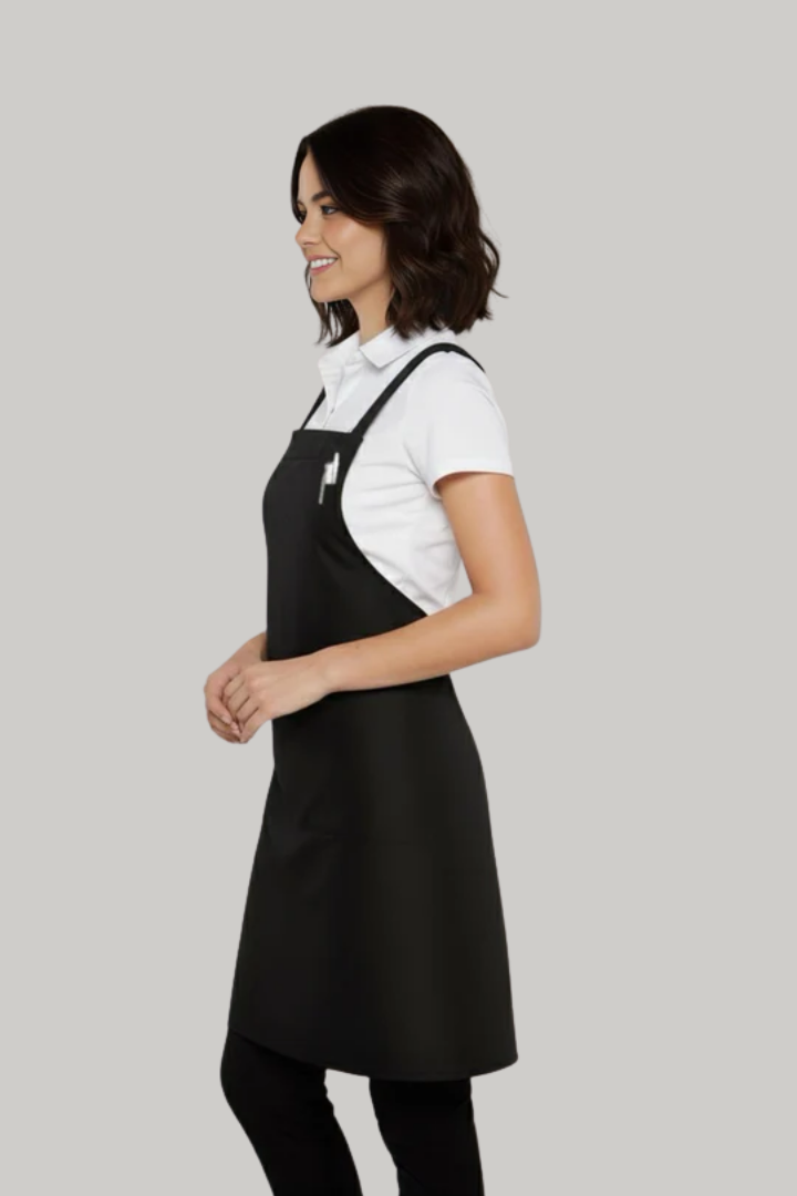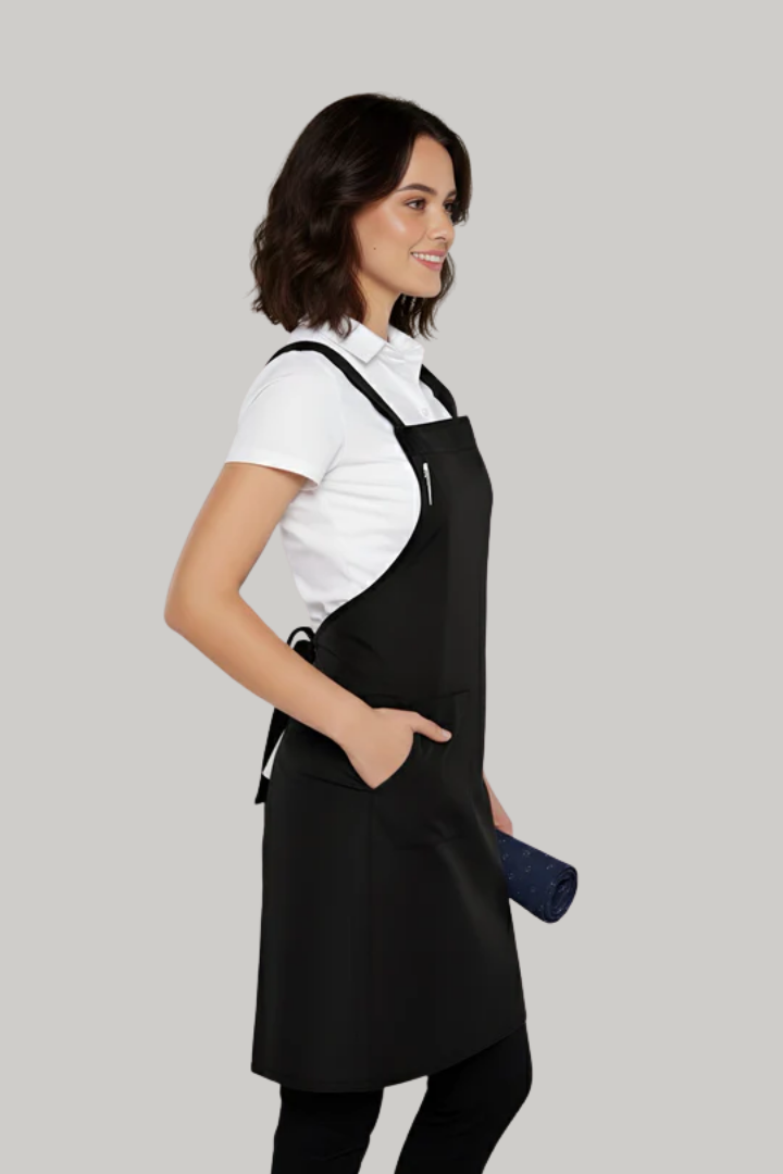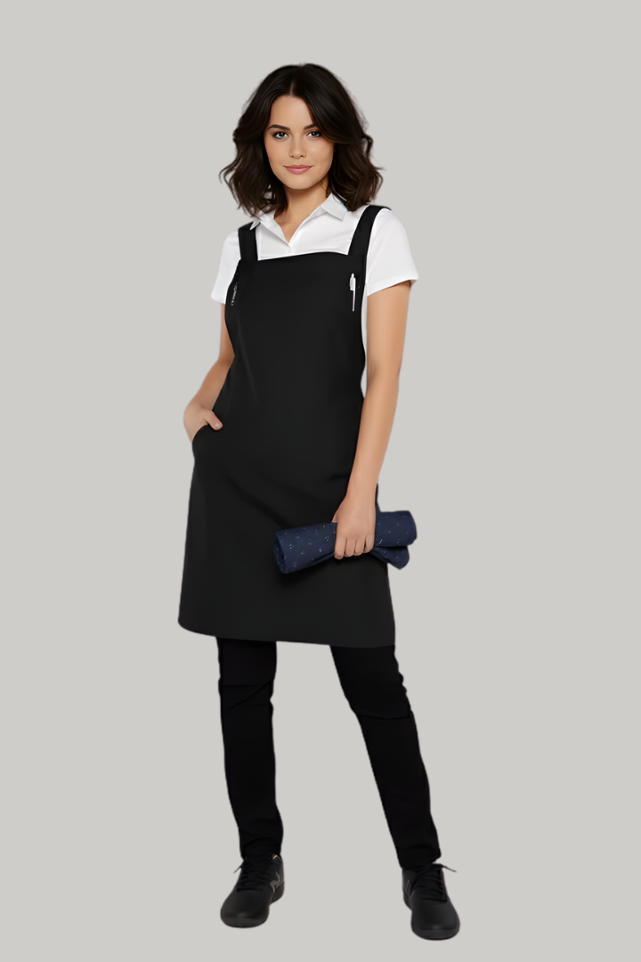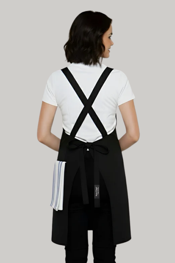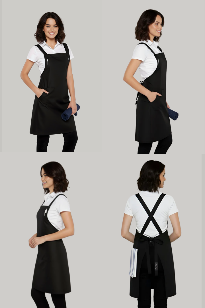 Its cross-over strap design distributes weight evenly across the shoulders, reducing neck strain while ensuring a secure fit. Made from lightweight yet durable fabric with reinforced stitching and bartack pockets, it’s built to handle busy kitchens and cafés.