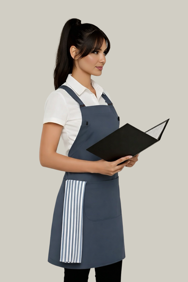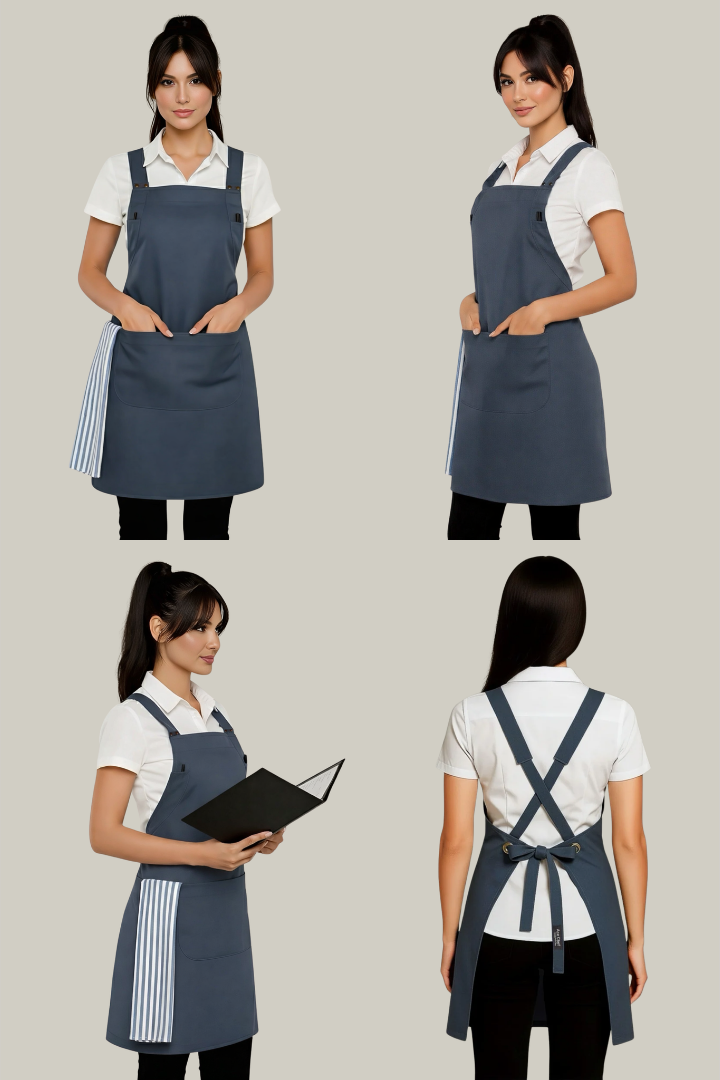 The Shana Crossover Apron is designed for chefs and hospitality professionals who need comfort, durability, and practical storage during long service hours.