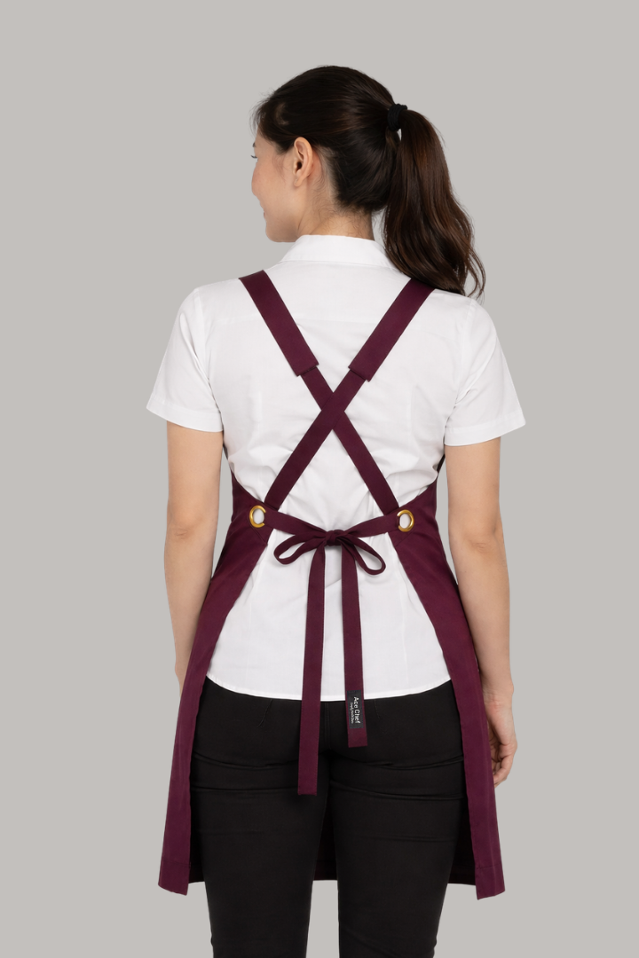 The Shana Crossover Apron is made from a long-lasting poly-blend fabric designed to resist fading and maintain its appearance wash after wash, reducing the need for frequent replacement.